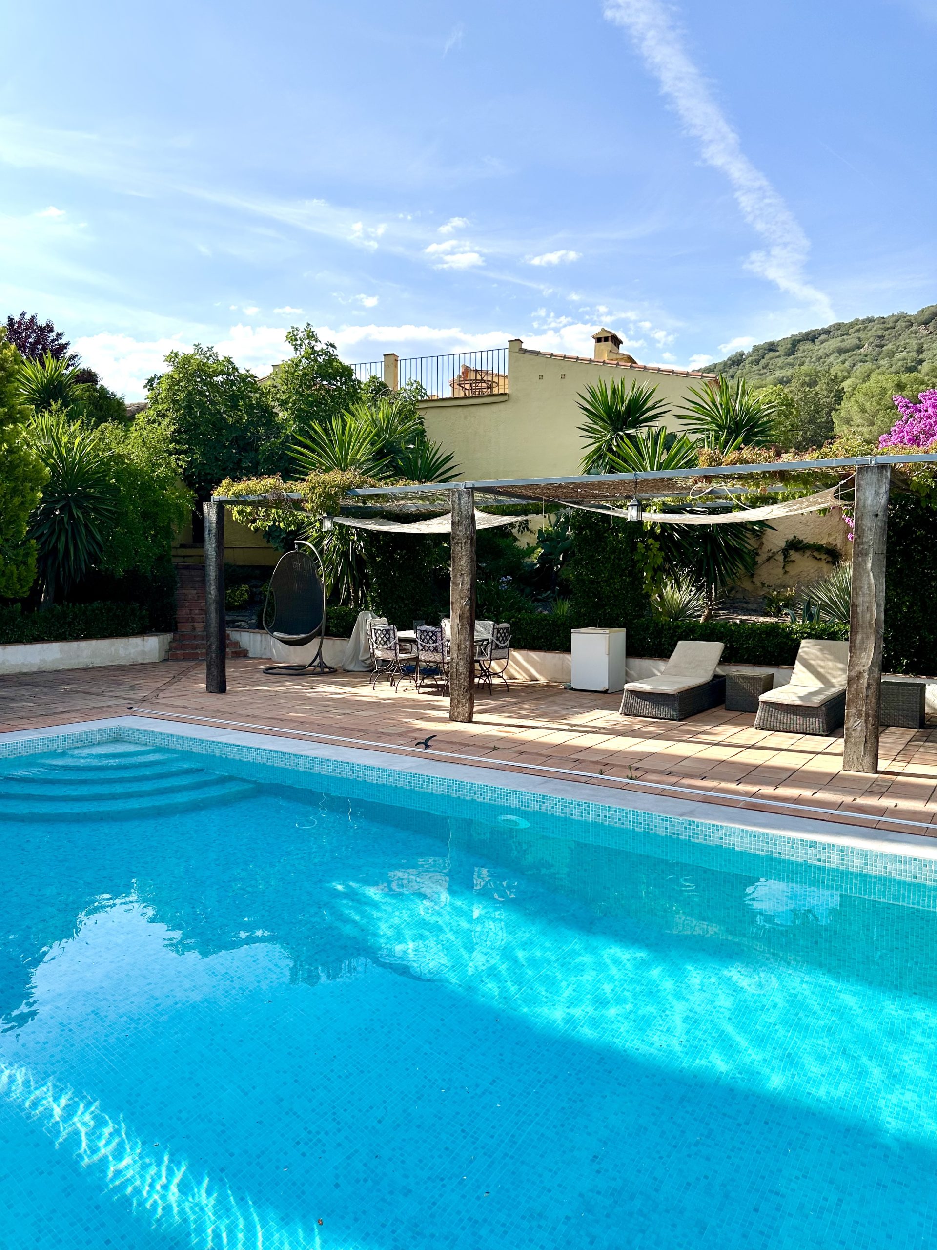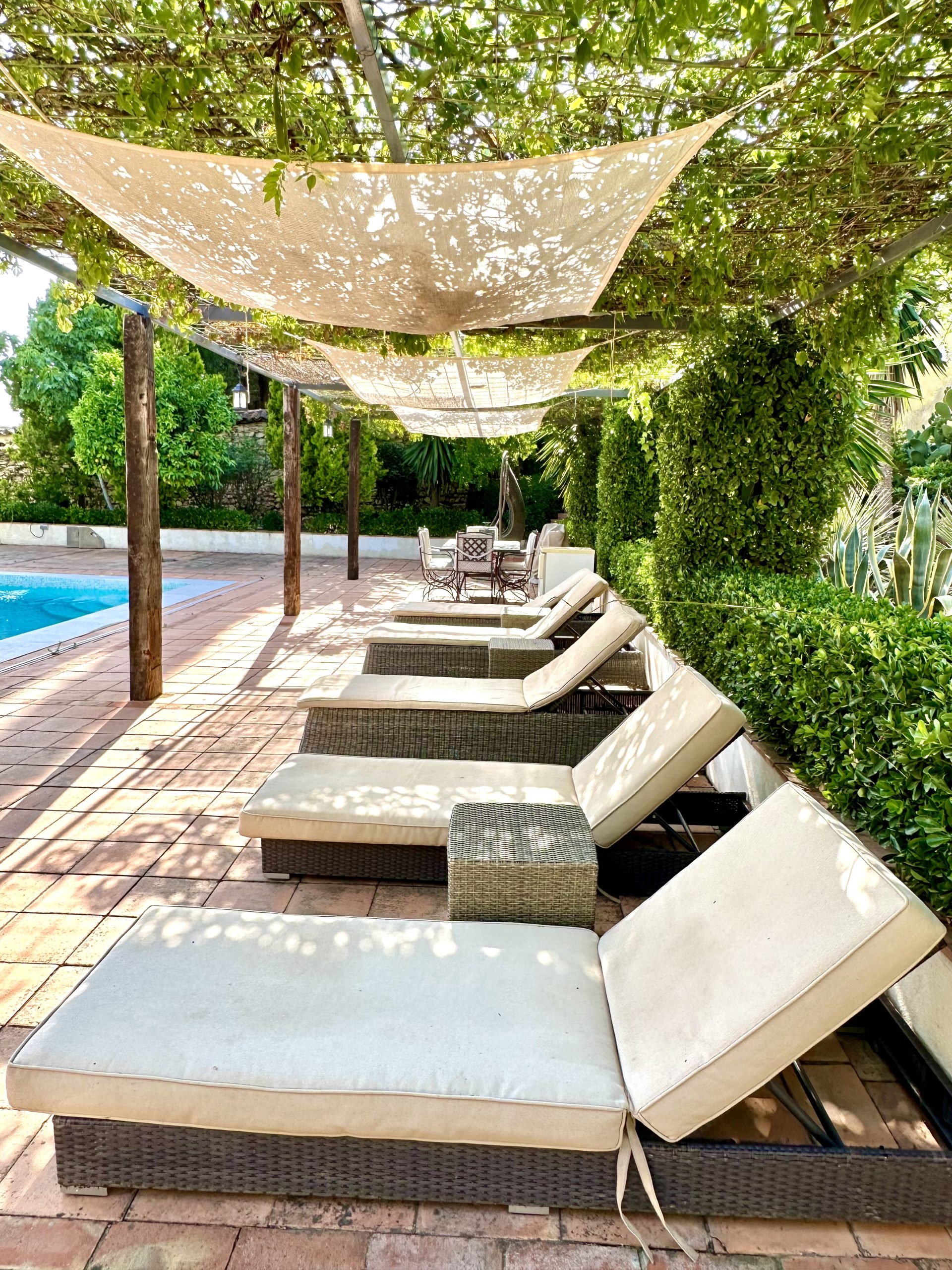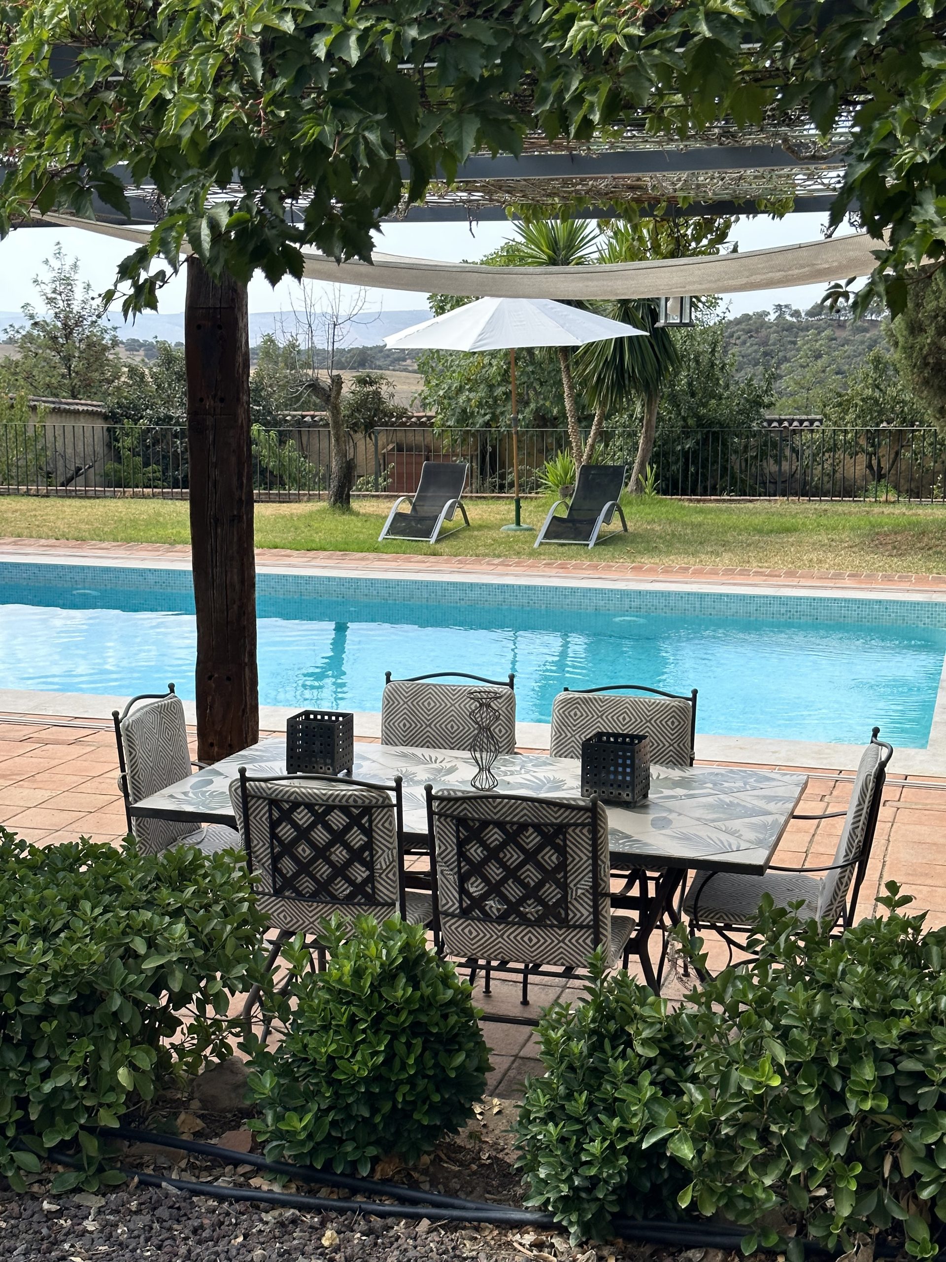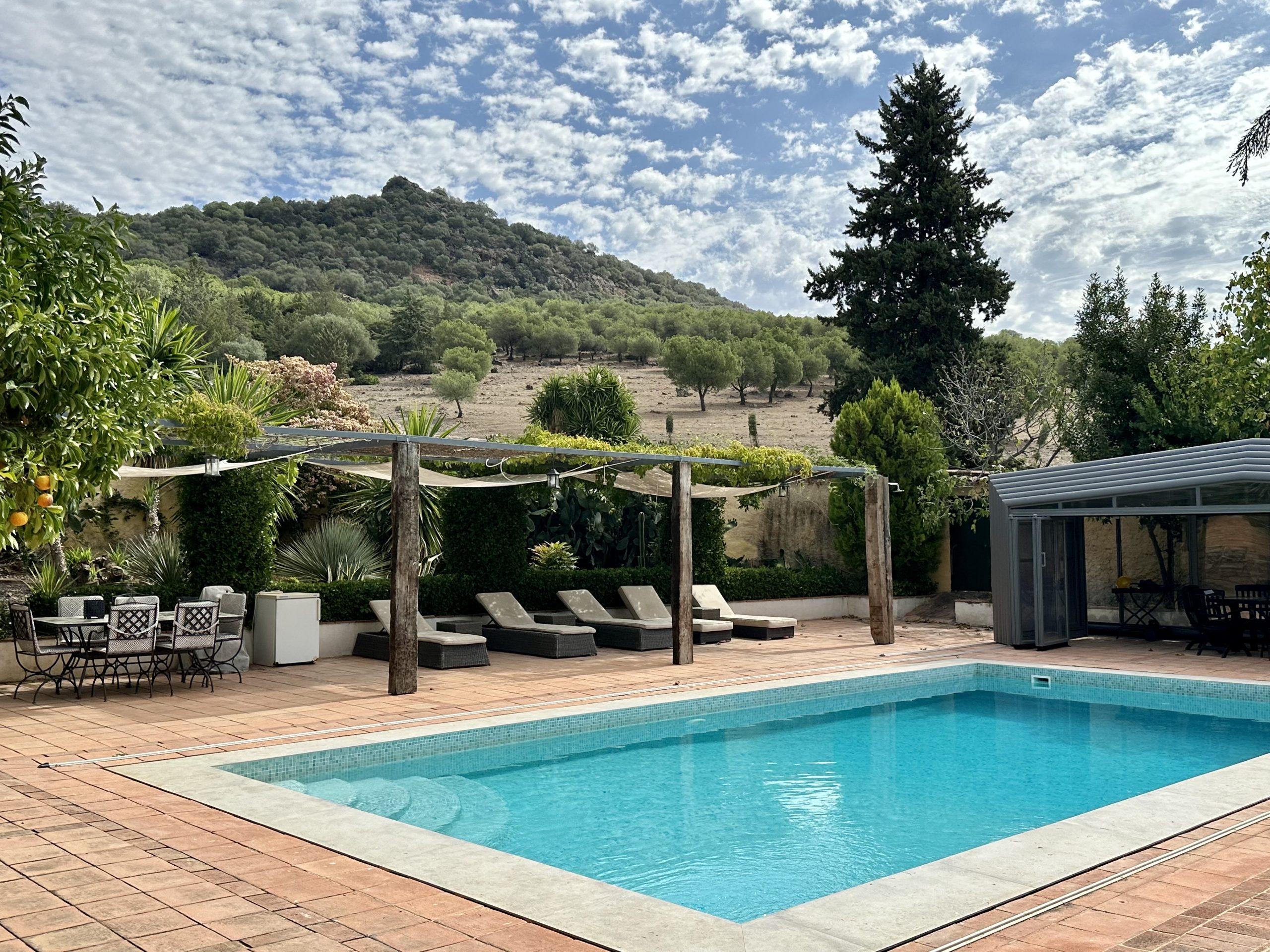 Piscina de sal, situada en la parte este del cortijo en un enclave con maravillosas vistas a Sierra Magina y Sierra de Cazorla. Rodeada por un jardín de exquisita belleza y con un porche cubierto de parra.