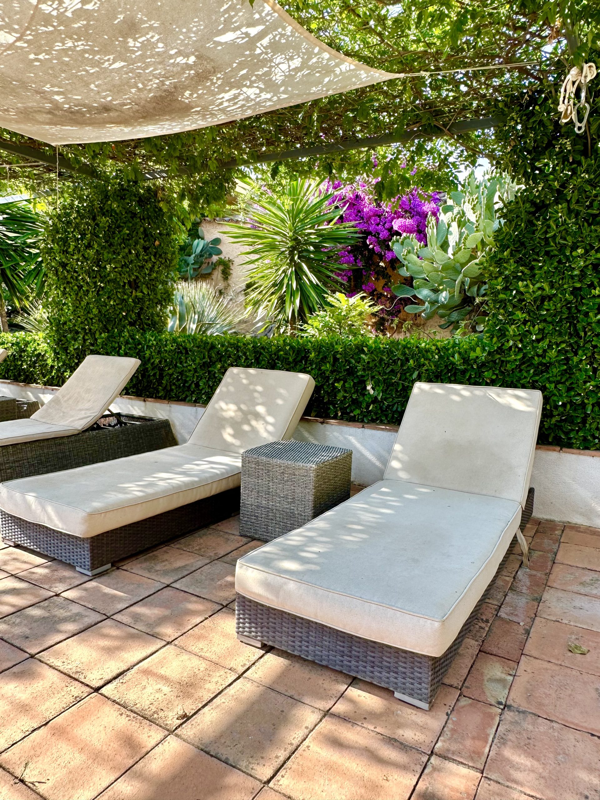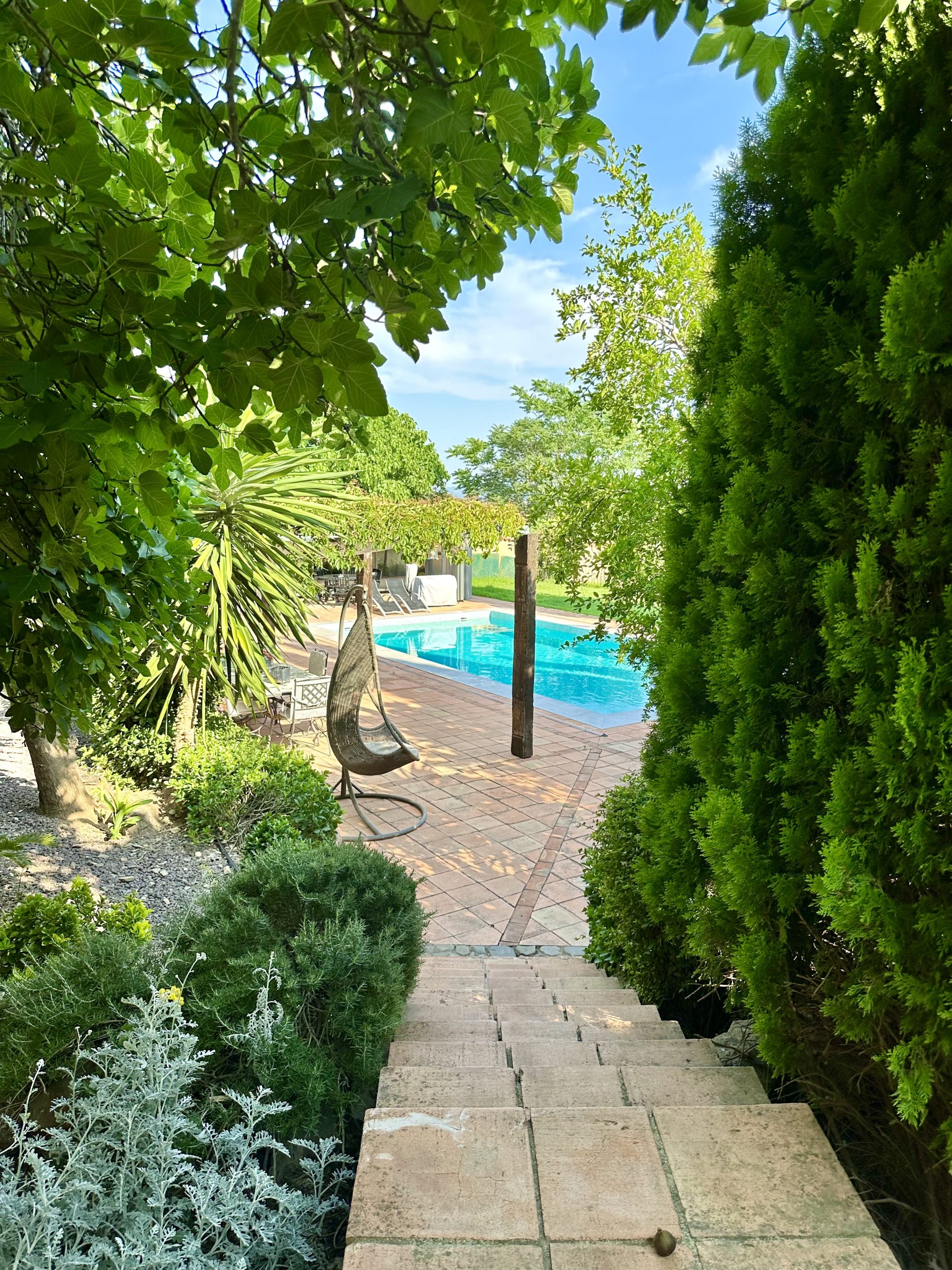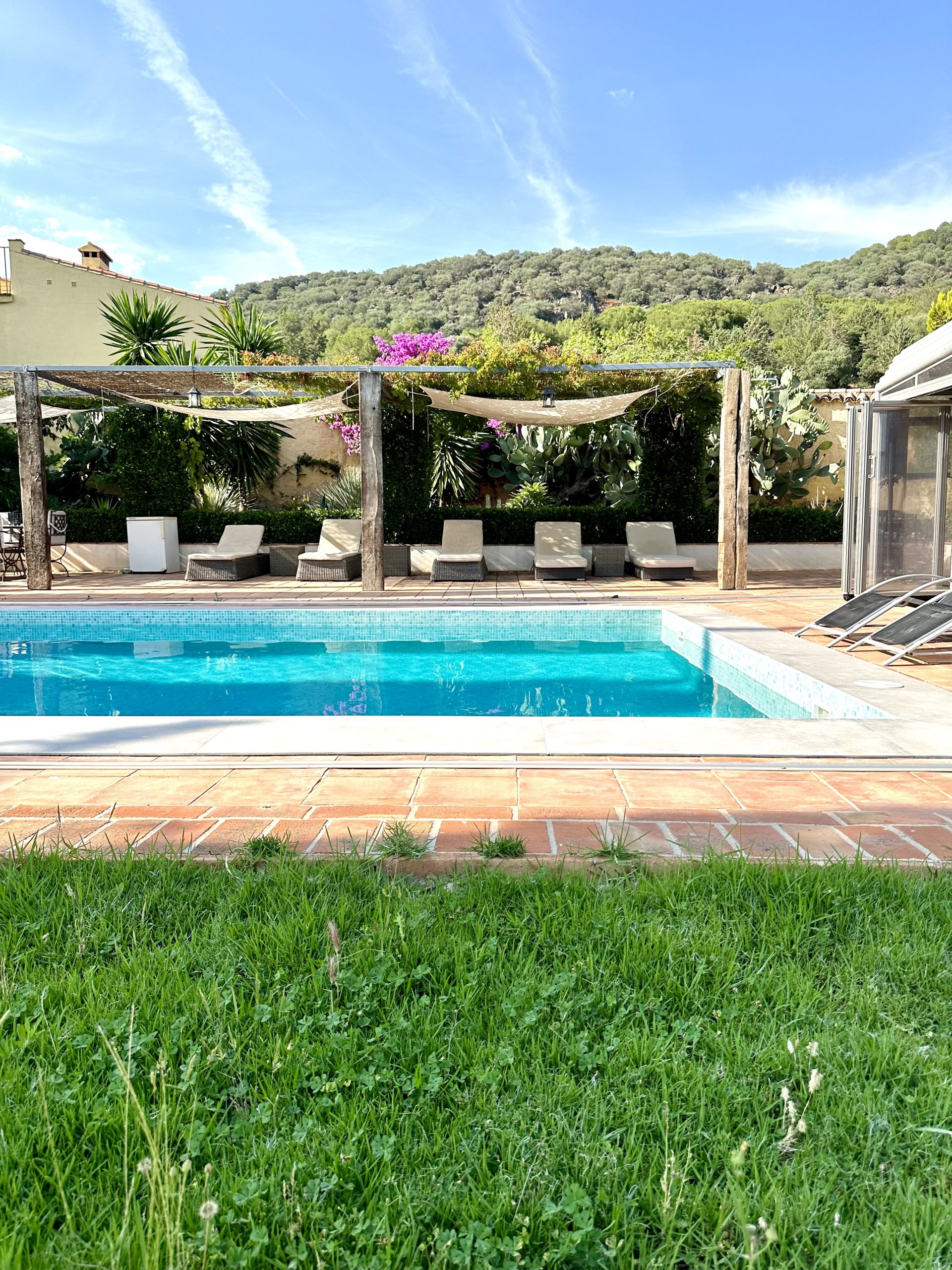 Piscina de sal, situada en la parte este del cortijo en un enclave con maravillosas vistas a Sierra Magina y Sierra de Cazorla. Rodeada por un jardín de exquisita belleza y con un porche cubierto de parra.