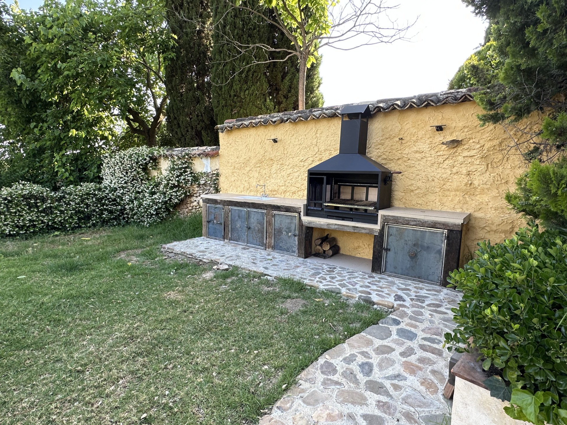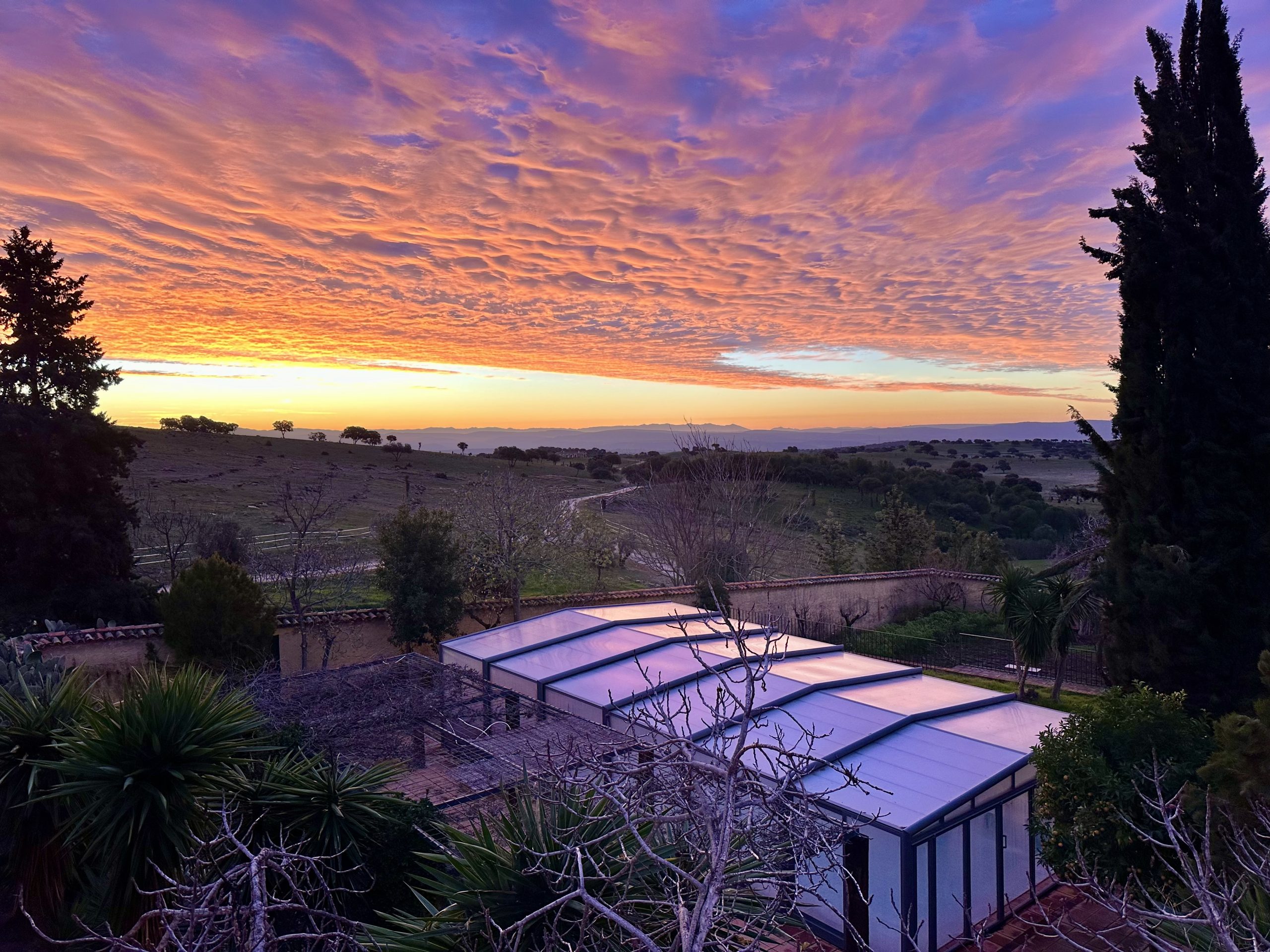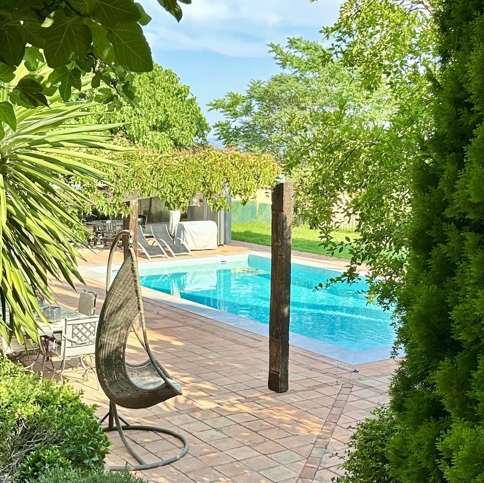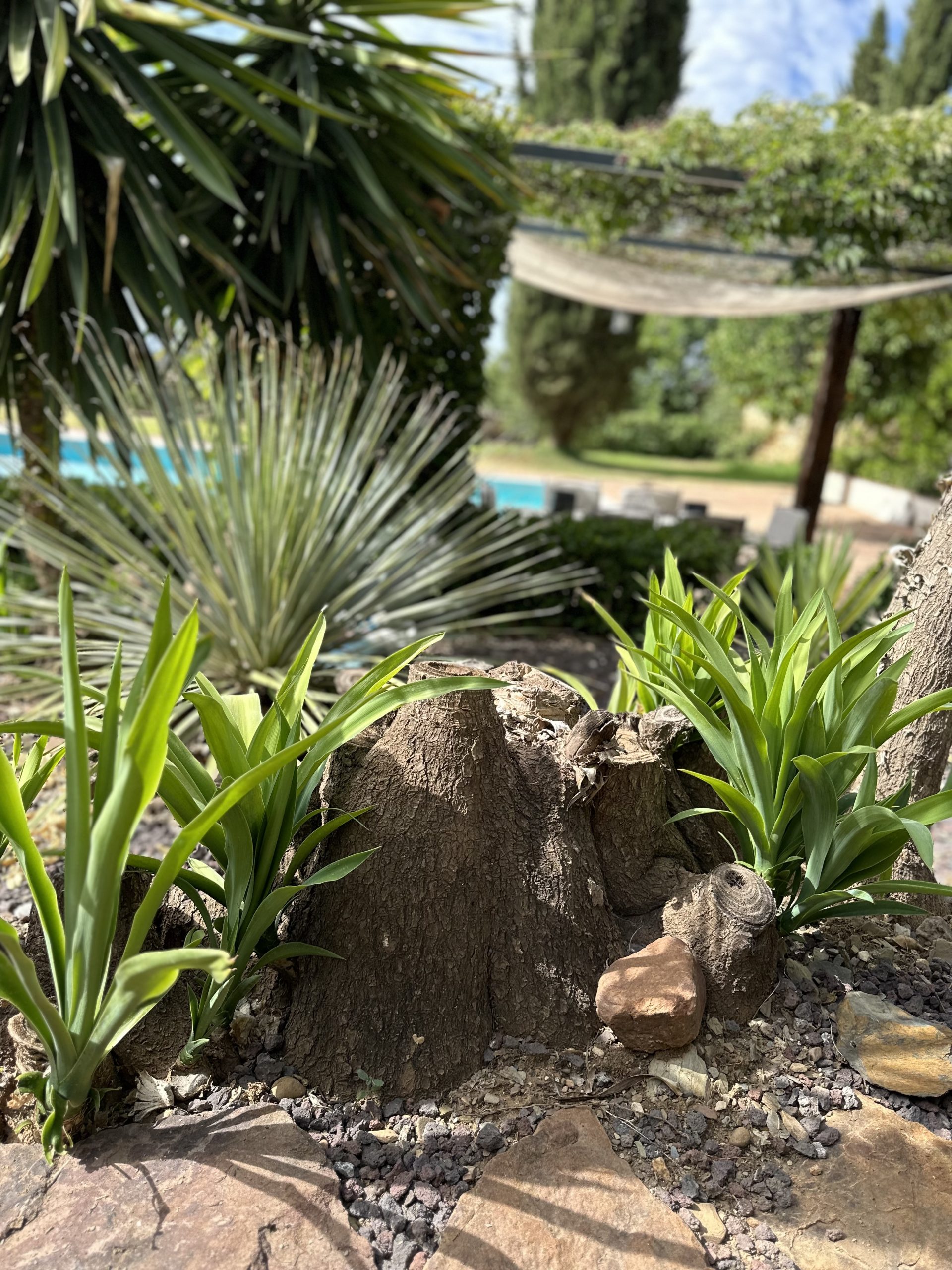 Piscina de sal, situada en la parte este del cortijo en un enclave con maravillosas vistas a Sierra Magina y Sierra de Cazorla. Rodeada por un jardín de exquisita belleza y con un porche cubierto de parra.